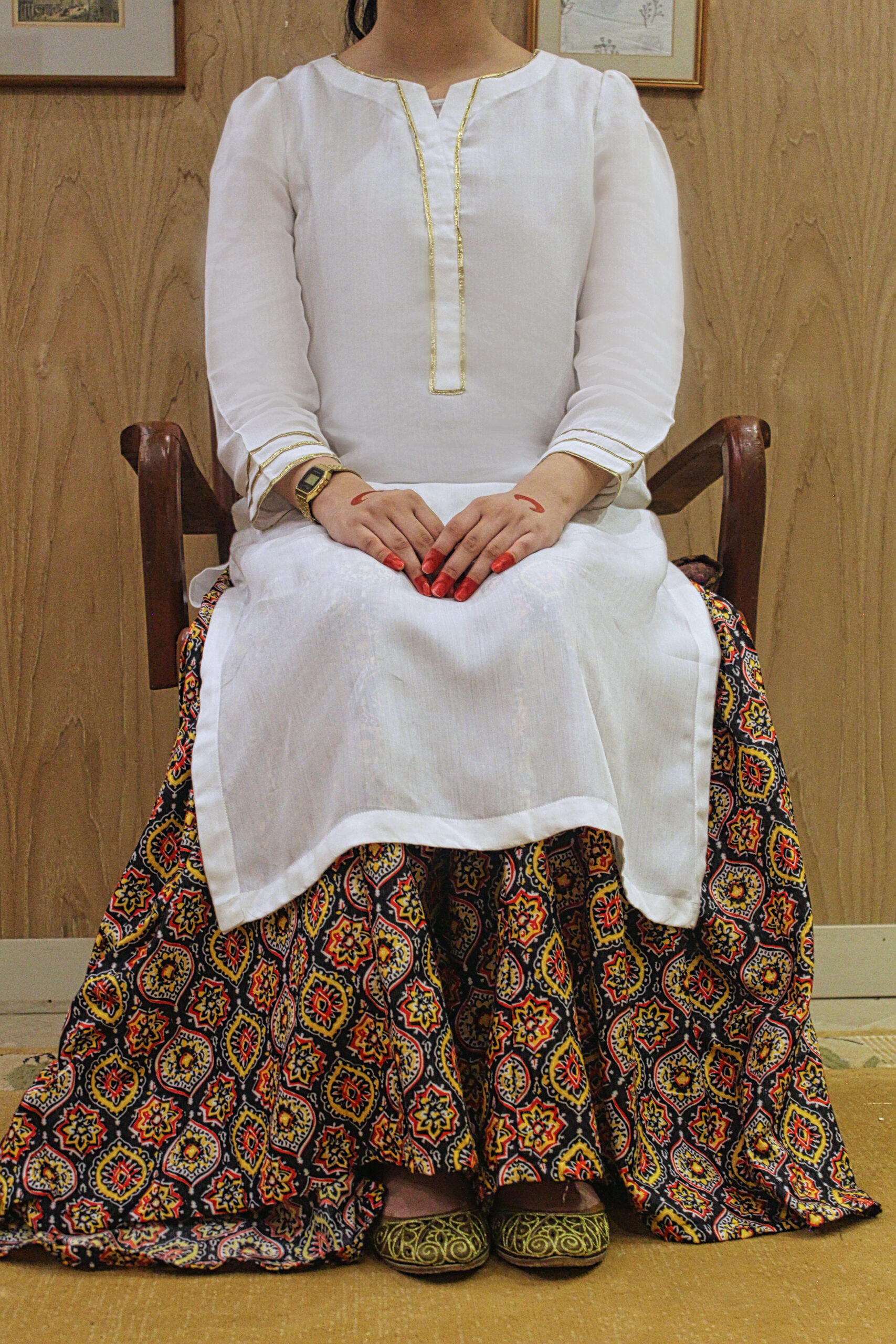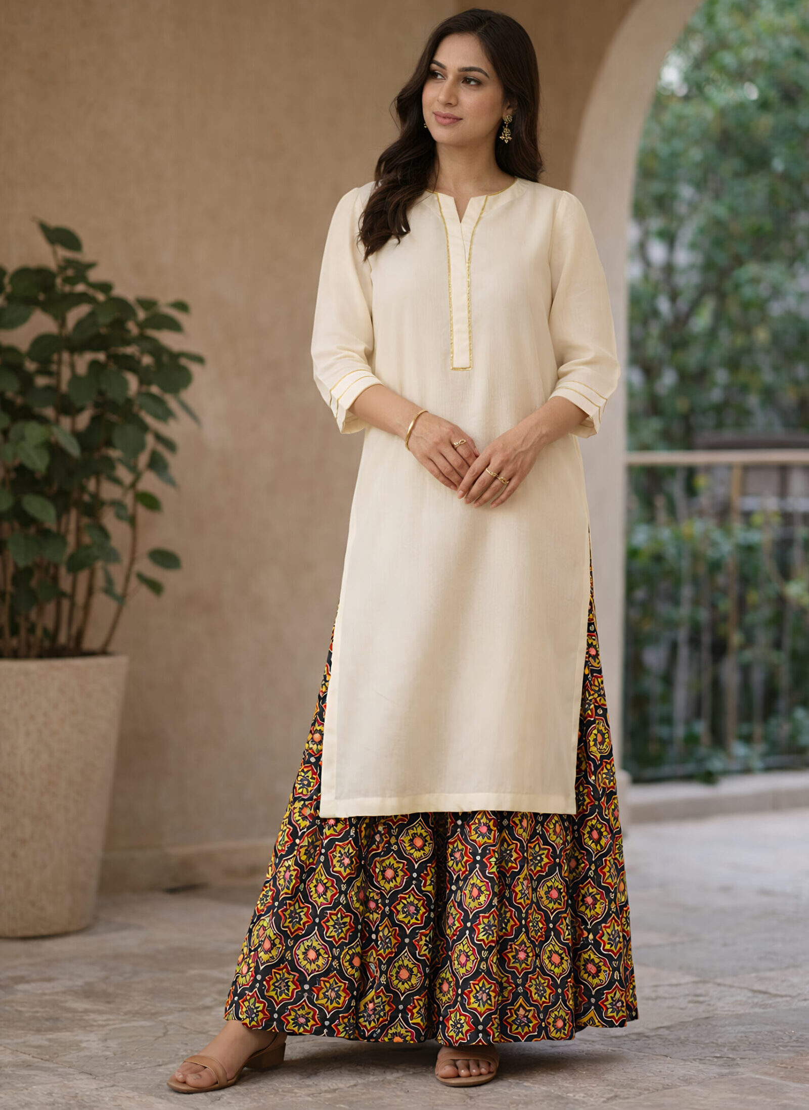 Dilbaro is a soulful two-piece summer ensemble that effortlessly blends simplicity with cultural nostalgia. It features a plain, off-white long shirt, cut in a timeless silhouette and stitched in a soft, breathable fabric — perfect for warm, slow days. The highlight of the outfit is the beautifully printed “ooncha gharara”, available in three rich colorways, each echoing the vibrance of traditional South Asian prints. The high-flared gharara adds movement and charm to the look, making it both playful and modest. Dilbaro is a tribute to everyday elegance — ideal for relaxed days at home, chai with friends, or strolls down memory lane.